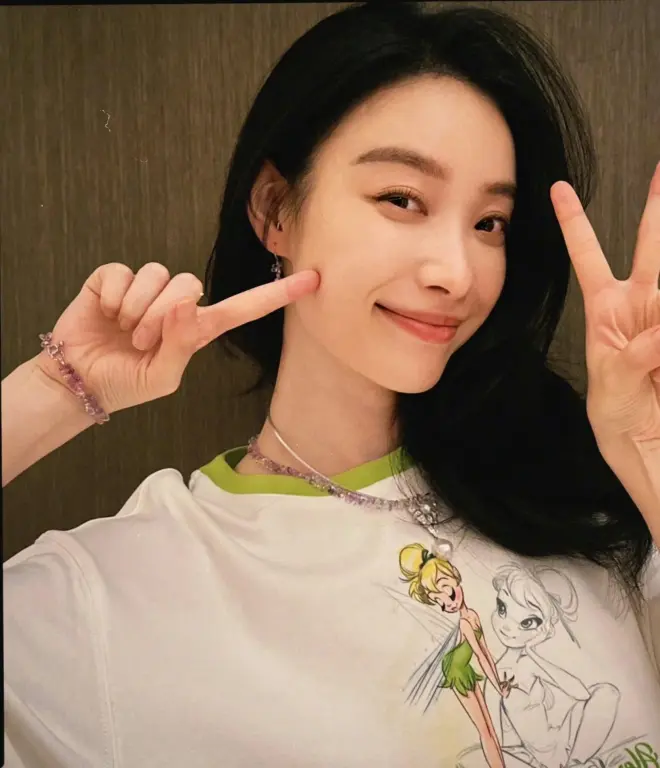 这件精灵公主T恤也太少女心了吧!清新的绿色搭配米白色,这不就是大自然的色彩吗,配饰上选择了甜美风的粉水晶,同款的粉色手链也少女感满满,优雅成熟的倪妮也有清新可爱的一面呢。