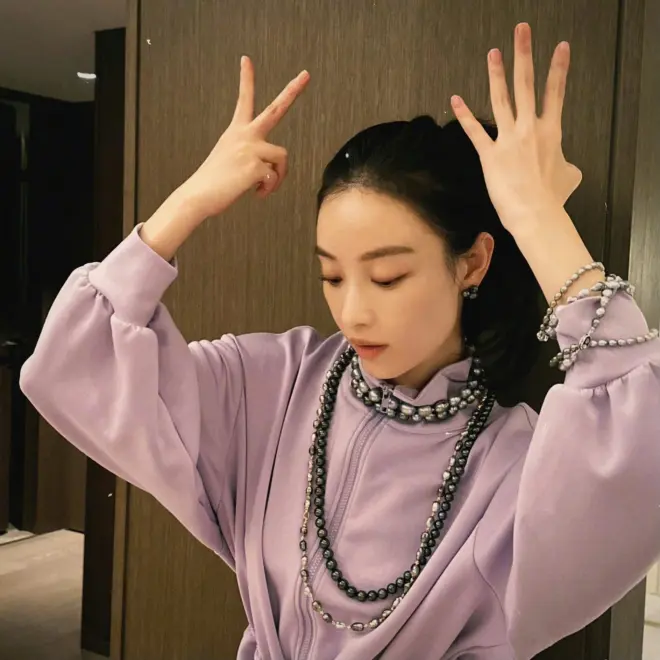莫兰迪紫运动套装休闲而百搭,但倪妮却叠戴了大串猫眼石项链和手链,有一种朋克的美感,如果换成皮衣的话,效果会更佳。