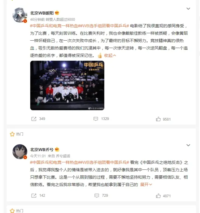 “在一次次失败中成长,为了最终的目标不懈努力,竞技精神真的很热血,吸引无数热爱赛场的我们沉浸其中。”2月21日,在组团观看电影《中国乒乓之绝地反击》之后,北京WB的暖阳实现了与传统体育前辈们的共情,路人影迷在话题下感叹:“没想到现在的电竞选手如此成熟。”