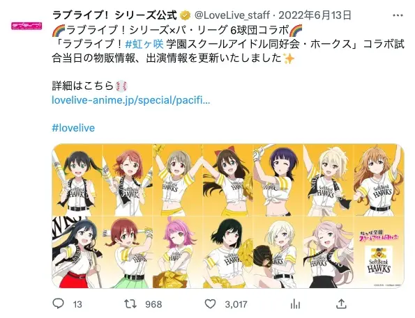去年今天,2022年6月13日,虹咲学园学园偶像同好会与福冈软件银行鹰棒球队联动比赛的详细信息更新。
