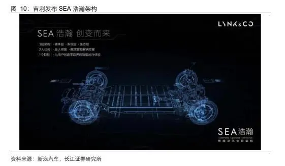 发布 SEA 浩瀚架构,吉利智能电动汽车战略进入加速阶段。2020 年 9 月 23 日,吉利正式发布 SEA 浩瀚架构,该架构是具备更高智能化水平和自动驾驶能力、交互体验也更加人性化的智能纯电架构。浩瀚架构以用户出行体验为核心,其作为吉利从汽车制造商向出行服务商科技转型的重要成果,标志着吉利进入智能电动汽车的系统推进阶段。