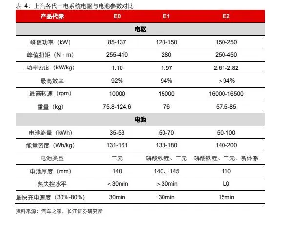 每一款车需单独设计电池和电驱动系统,耗费时间和精力多。E0 平台的电机参数为,其峰值功率为 85-137kw,峰值扭矩为 255-410 牛米,重量为 75.8-124.6kg,最高效率为 92%,最高转速为 10000rpm;电池参数为 35-53kwh,能量密度为 131-161wh/kg。