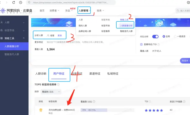 分享一个确定产品精准人群画像操作思路(主要针对有历史成交店铺) 1:输入网址:dmp.taobao.com 进入达摩盘路径。具体步骤如下图!