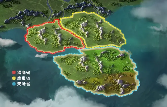 新剧本中我们将会看到全新地图,可以看到猎鹰公国中共有3大地区,分别是天际省、鹰巢省和猎鹰省,这3个地区也代表了新剧本的3个阶段,领主大大们的出生地位于天际省。