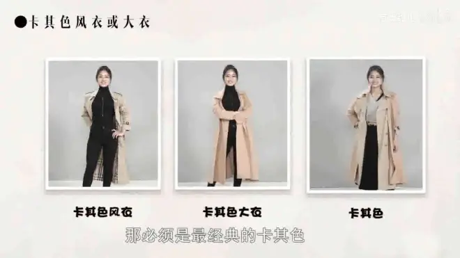 黑色高领毛衣,灰色大V领毛衣,贴身牛仔衬衫,白色长衬衣,卡其色风衣等