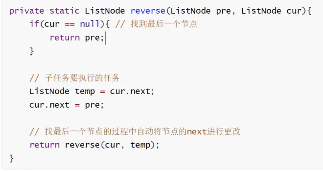 每个节点要执行的子任务是改变next指向,所以,我们可以使用递归完成任务即可,使用递归之前要考虑每个子任务要执行的操作是什么?以及什么时候执行对应的子任务?是刚开始还是最后一个节点?以及对应的递推公式
