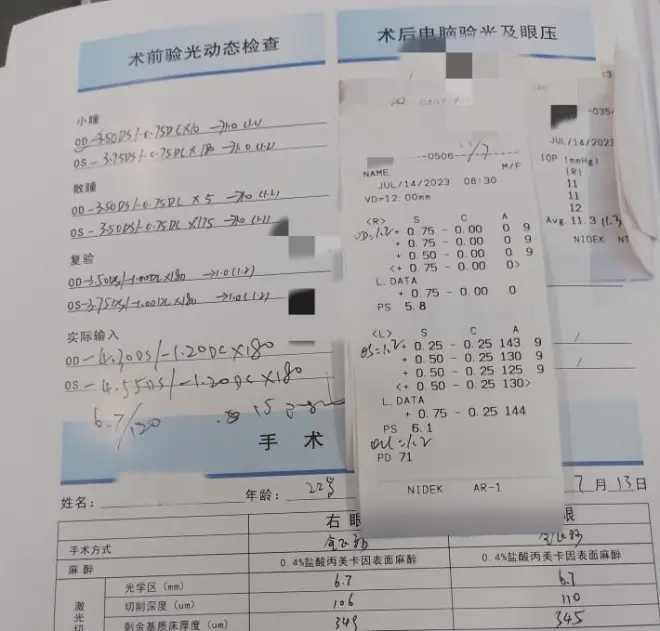 术前度数:右眼视力350°+ 75°散光,左眼视力375°+ 75°散光