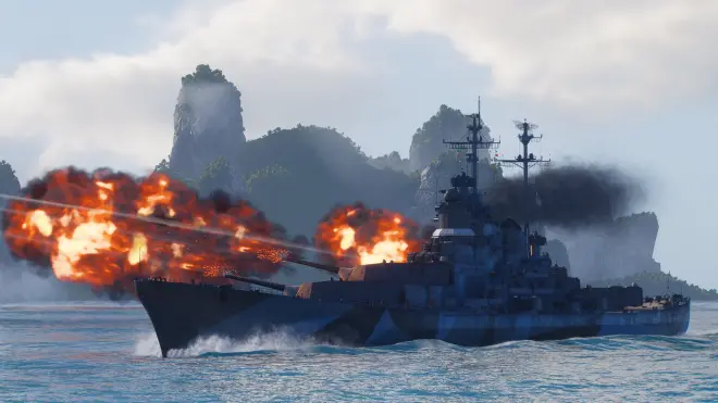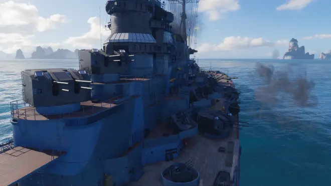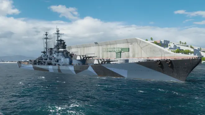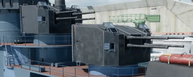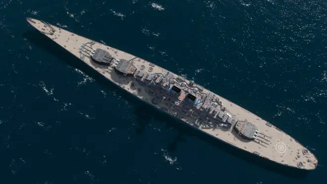 侧面视角,乌沙科夫安装了更加厚重的装甲,这导致其吃水加深,从而让敌人在远距离几乎无法重创其核心舱段。乌沙科夫总体与克里姆林无特别大的区别,只不过是极致加强了装甲防护的苏联战列舰。