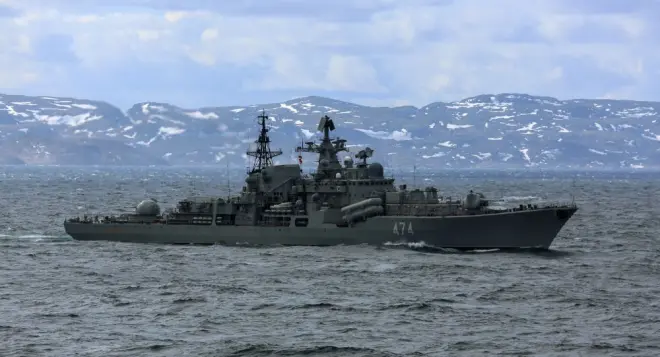 舰艏正前方视角,乌沙科夫采用了苏联战列舰同款的上扬式舰艏,使得其在恶劣海况不至于被浪花打湿舰艏甲板,或者能使用坚固的舰艏冲破北冰洋的浮冰。乌沙科夫的舰桥和克里姆林最大的区别是采取了类似亚历山大·涅夫斯基的大舷窗式指挥塔布局,或许是考虑到在战后时代并不需要太多的近距离交火吧。