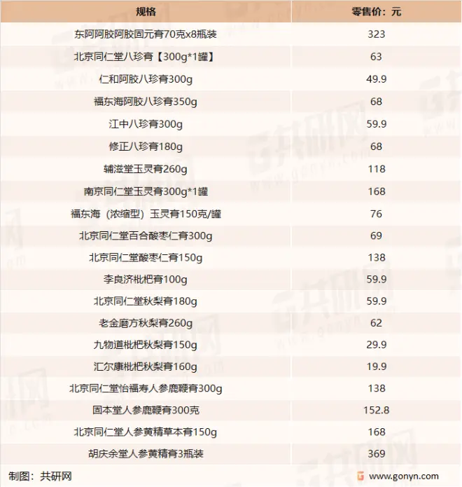 受产品品牌、成分含量、规格、功效、口碑等因素的影响,养生膏产品价格存在较大的差异。