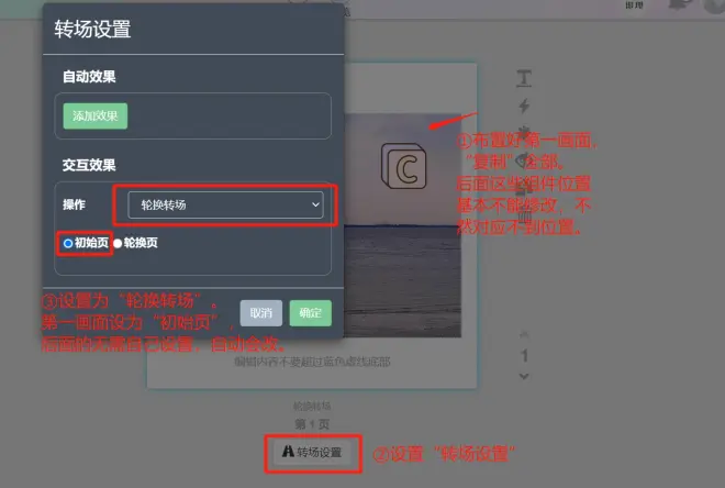 如果是已经设计好的图片(没有单独的触发组件素材),可以在第2到后面页,分别在触发位置加“页面组件-形状-基本形状”中选择图形,并设成透明色,调参数如图二。