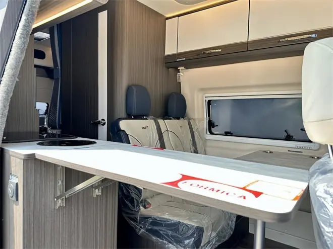 来到车内会看到,车前方标配可打开斯洛文尼亚进口大尺寸天窗,车内采光通气的好帮手,天窗四周配有加强梁,比原车更坚固!就餐区旁边的观赏窗尺寸也比较大,可以带来不错的视野,顶部则配置了基础的吊柜,以方便日常存放物品使用。后期也可选装一张电动升降双人床。
