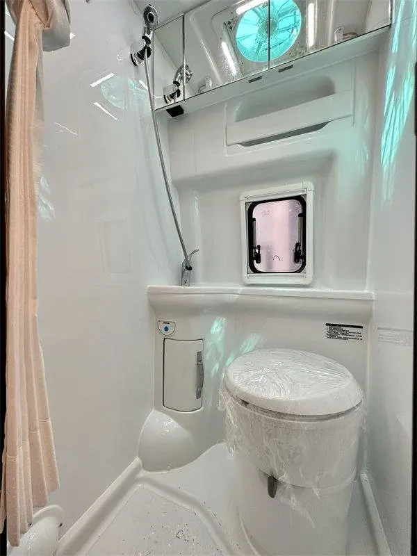 卫浴区采用整体式设计,内部设施齐全。配有淋浴花洒、洗手池、外推窗、储物柜、房车专用坐便器等,顶部配有换气扇,保证了内部空气的流通,使内部环境干爽舒适!在晚上的时候,冲一个热水澡,消除在旅途中的疲劳,让你第二天元气满满的去玩下一个城市!