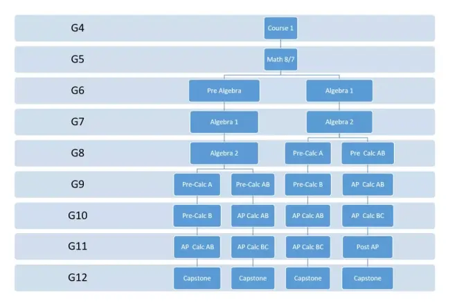 其次,在G7结束的时候,学校还会对之前G5后的快班(Algebra 2)再进行一次分层考试,同样分快慢班,即Pre-Calc AB(快班)& Pre-Calc A(慢班);