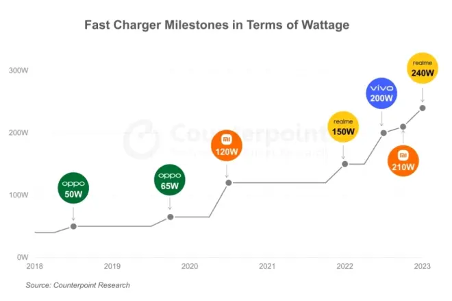 中国品牌将快充作为卖点 来吸引消费者。例如,realme和小米提供的智能手机功率超过200W。此外,小米和 OPPO最近展示了智能手机 具有令人印象深刻的300W快速充电能力。这些品牌的目标是提供极快的充电速度,让用户在几分钟内就能给手机充电。