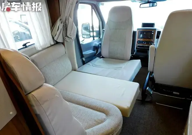 驾驶室的空间还不错,相比较国内房车各种繁复的设计和科技感的屏幕,这款房车走了极简路线,机械感也比较强,而且在车的额头处也做了天窗设计,驾驶室显得更加通透。驾驶室上方配置液晶电视,日常娱乐需求也能提供。