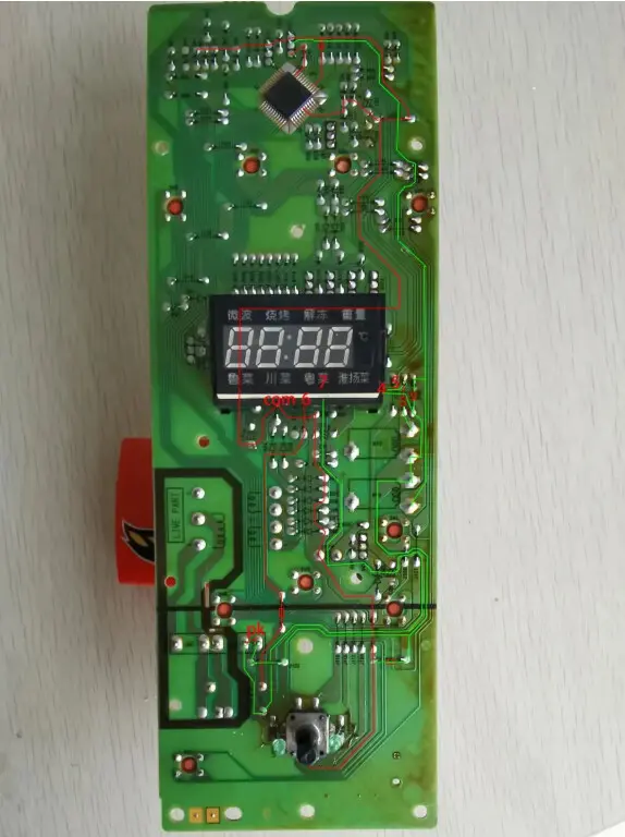 控制电路板也就是PCB板上的二次回路,LG微波炉(WD700)程序比较多,二次回路还是比较复杂的。PCB板上的按键输入信号并不是直接触发晶闸管,而是把信号输入到了微处理器,PCB板上的3个继电器是由STCC02模块来驱动的。