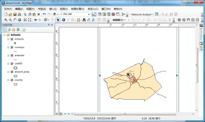 (2)源数据文件(airport.gdb),其中各图层含义如下:“Schools”表示初级、中级、高级和私立学校的位置;“Runways”表示机场跑道的位置;“Arterials”表示主干道;“Cne165”表示噪声等值线;“Airport_area”表示计划的机场扩建区;“county”表示县界。