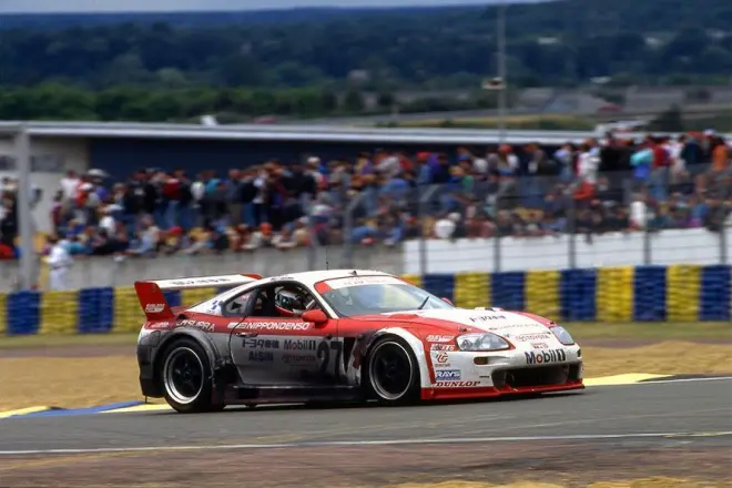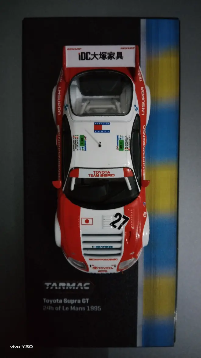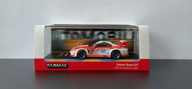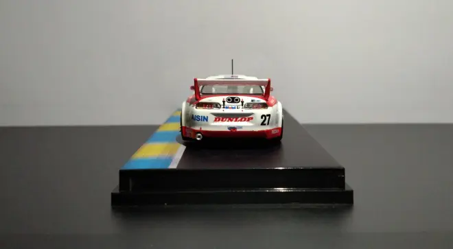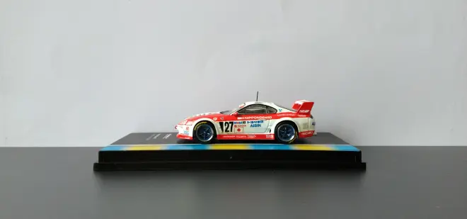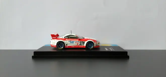 先来简单介绍一下这台赛车,丰田Supra GT LM基于同时期Supra GT500的底子打造,用来满足丰田对当时炙手可热的GT1组别参赛需求。这台车参加了1995年和1996年勒芒GT1组别耐力赛事。虽说并没有取得亮眼表现与良好成绩,但也是丰田勒芒冠军梦上近一步的探索。今天讲解的车模就是取得1995年勒芒24小时耐力赛全场第14名,GT1组别第8名的丰田SARD车队27号Supra GT LM。