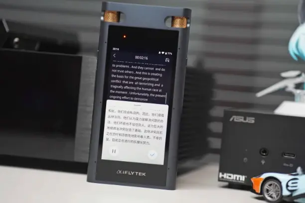 讯飞智能录音笔SR702功能之所以能这么强大,是因为内置了八核高性能处理器,在这段时间的使用过程中,可以感觉到人声和文字的同步速度非常快,而出稿和翻译的速度也非常流畅,完全不会有迟滞和卡顿的现象出现。