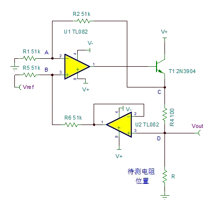 需要注意的是,UC受电源和三极管T1的饱和电压限制。待测电阻R过大,则UC被限制在电源电压以下,此时电流源进入非线性区域,电流不再恒定受控于Vref。