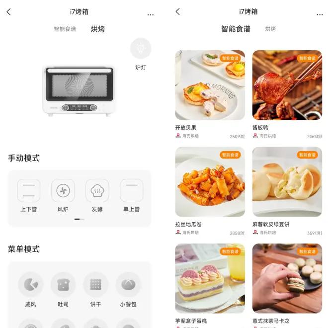 大多数家庭烤箱还是需要实体操控调节,升级款i7pro支持APP操控,下载对应的APP就可以。上下管温度、时间,炉灯都可以自行调节,涵盖烤箱上的所有功能设置,操作更加便捷,还有智能食谱,烘焙新手也能照搬快速上手,做出好吃的成品。