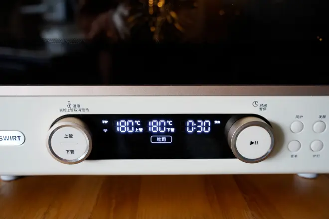 左右两个旋钮,一个控制温度,有独立的上下管按键,可以在平炉模式下实现上下管独立控温。另外一个旋钮是控制时间,即便你是烘焙新手也不用担心搞混。