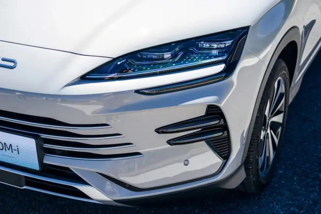 我们本次试驾的,是一台宋PLUS DM-i冠军版150KM旗舰PLUS 5G车型,属于顶配版本。它采用了“海洋美学”设计前脸,并将原先的汉字“宋”logo更改为“BYD”的英文字母Logo,以便和王朝系列车型进行区分。进气格栅变为了横辐条无边界样式,还点缀了精致的亮色饰条。同时,设计师还在前杠两侧,设计了大尺寸的导风口,营造出了更强的运动感。