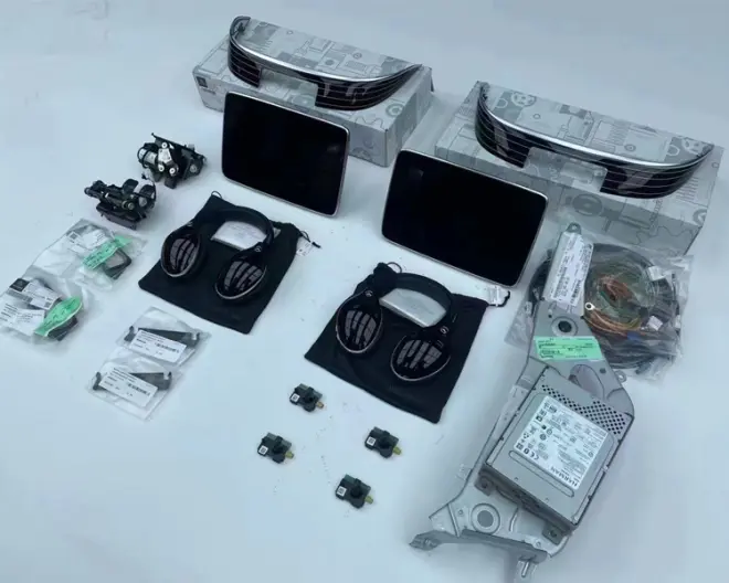 后排娱乐配件:主机,线材,主机支架,显示屏2个,耳机2个,天线4个,后排娱乐桃木2个,座椅靠背板2个等这些配件组成。