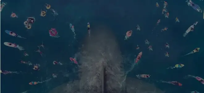 一部动作片,不求有多深的高度,但强行降智的做派,让观众觉得自己是“RZ”,比如一个偷拍鲨鱼的直升机撞上了主角们的船,引发了整部剧的高潮,就很离谱。