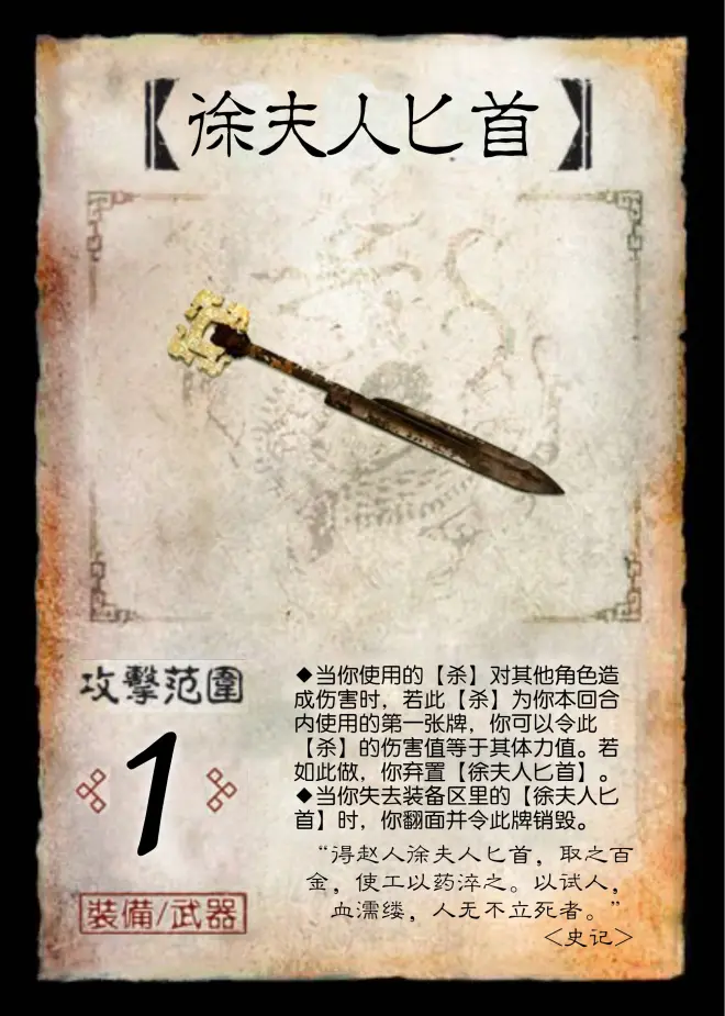 徐夫人匕首:这个荆轲的专属武器其实是我设计的关键点。【徐夫人匕首】的加伤配合侠隐的强命飞刀,可以实现一击必杀,让荆轲成为战国的“恐惧魔王”。然而为什么历史上的荆轲没有刺杀成功呢?因为当时荆轲想的并不是直接杀死秦王,而是挟持秦王来进行后续的战略谈判。正是这种犹豫,令荆轲错失了杀死秦王的良机,这也符合“若此【杀】为你本回合内使用的第一张牌”的要求,荆轲必须一出手就是杀招才能生效,想用【铁索连环】或者其他复杂操作来博取更大收益只能竹篮打水一场空。