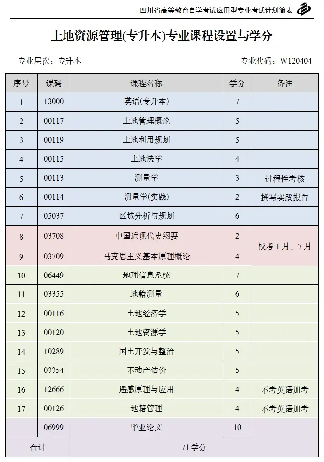 四川省土地资源管理专业自考本科统考科目考试计划: