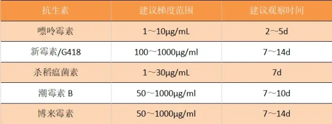 嘌呤霉素(Puromycin);新霉素/G418(Neomycin);杀稻瘟菌素(Blasticidin);潮霉素B(HygromycinB);博来霉素(Zeocin/bleomycin)。