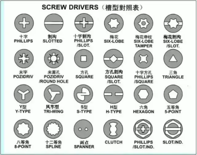 螺钉的槽型决定了装配和拆卸时使用工具头的形状统设计中尽量使用十字和一个字。详见下图。