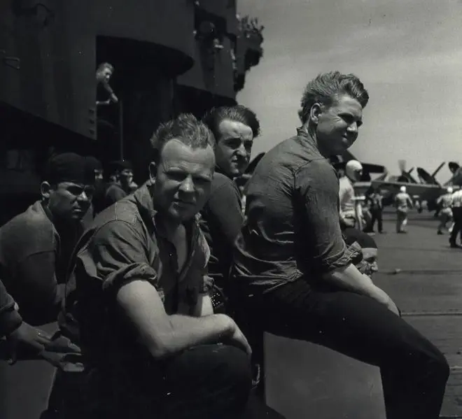 1943年左右,在美国约克城号航空母舰上工作的水手。