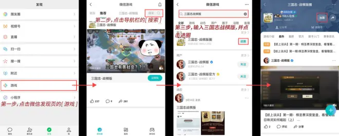 打开微信,进入【发现】页面,下滑点开【游戏】入口,搜索“三国志战棋版”,点击即可进圈。