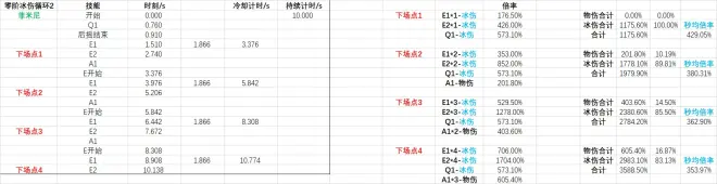 同样的,利用Q重置E的冰伤循环,可以看到,有四处合适的下场点,分别是4.704秒、7.170秒、9.636秒、12.101秒。秒均倍率随时间逐渐降低。