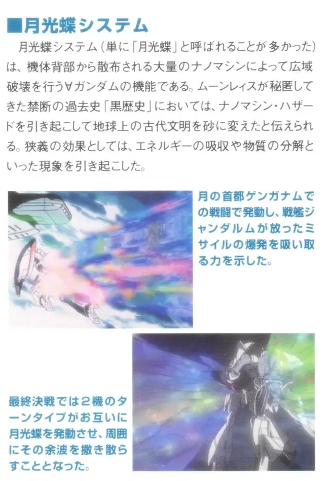 倒A搭载的一说被称之为文明破坏装置的系统。使用时从背部的散布口撤出大量的纳米机器,狭义上的效果是分解破坏目标物(这个“目标物”在GFF和GPF的说法包括:所有物质、有机物、人造物等,所以这里概括为“目标物”了)和吸收能量,详细的原理与效果皆不明(在动画中还有吸收爆炸冲击和光束的效果,动画结尾倒A和倒X使用月光蝶对战后被封印在“茧”中也是月光蝶的效果,HGCC倒A说明书还称月光蝶是倒A最强的防御手段)。月光蝶中的纳米机器的来源不明,可能是纳米机器的自我复制或从别处转移过来的。在黑历史中,倒A一边高速飞行一边展开月光蝶,使月光蝶覆盖整个地表,月光蝶之内雷电与风暴肆虐。最终月光蝶摧毁了地球上的文明、改变了地表的地形,使整个地表被月光蝶产生的“新表土”覆盖。在正历时代倒A与倒X决战时启动的月光蝶,出力仅有最大出力的1/5,由此也可见月光蝶系统的强大破坏力。顺带一提,正历中倒A的兄弟机倒X在解析了倒A之后也展现了使用月光蝶的能力,但倒X原本有没有搭载月光蝶系统还是个未知数(有趣的是无论动画还是设定强调展开月光蝶终结黑历史的都是倒A而没有提倒X),推测可能是倒X解析倒A的同时获得了月光蝶能力。