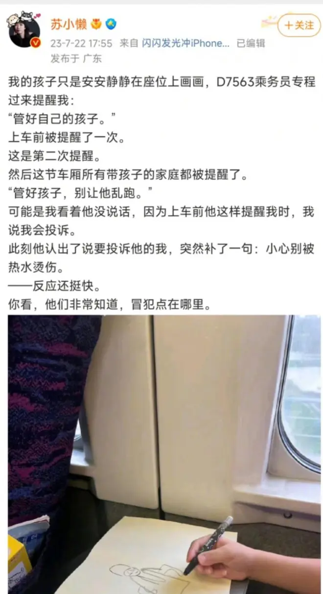 近日,著名作家苏小懒在乘坐广州至珠海的动车时,遭遇乘务员两次提醒“管好小孩”,引发了社交平台上的广泛讨论。针对此事我从以下几个方面进行讨论和评述