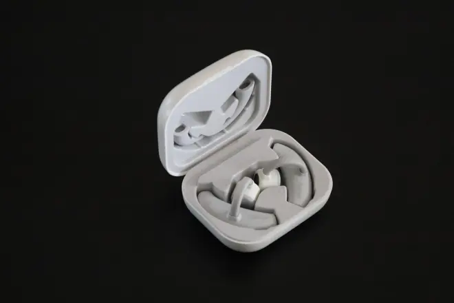 耳机仓内部有耳机主体和“犀牛角”配件,耳机采用类似于耳夹式的设计,取出特别方便,耳机电池仓的上边是可更换的配件,可以选择“戴或者不戴”犀牛角。