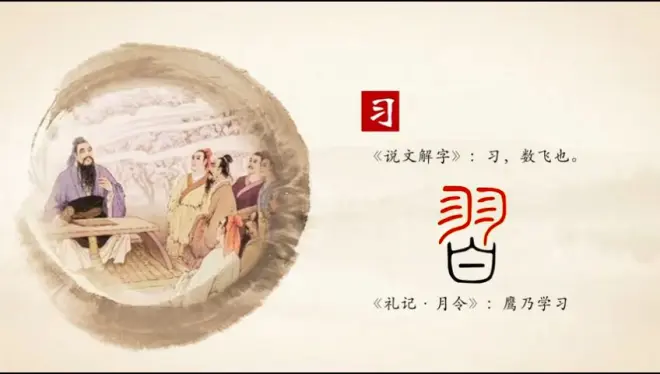 习,内涵是行为实践,说文解字,从羽,shuo 屡次飞行,小鸟学飞,老鸟带着的过程。