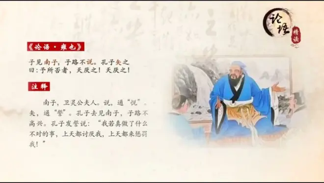 子见南子,卫灵公。子路不悦。孔子袒露一切,无隐。表达教育的诚意,用心灵触动另一个心灵。诚意是老师自我修养的高度。