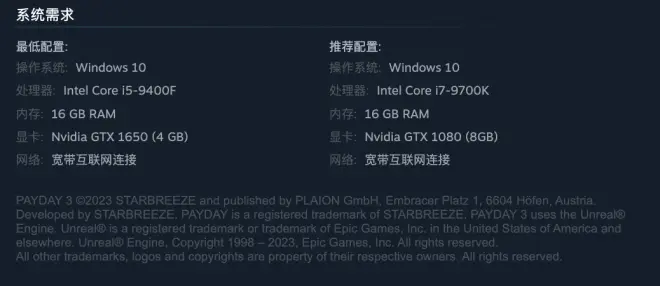 为了让玩家顺畅地畅玩《Payday 3》,游戏开发者提供了最低和推荐的配置要求。