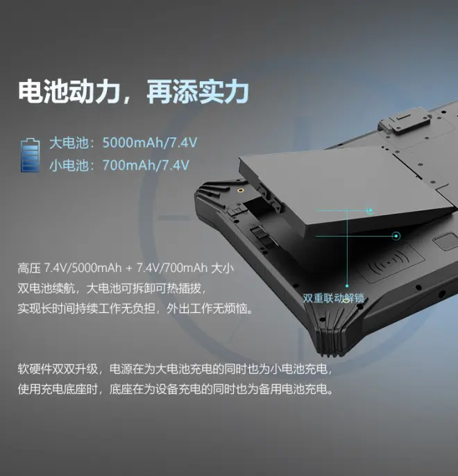 工业三防平板配备了高压7.4V/5000mAh +7.4V/700mAh大小双电池续航。这种设计使大电池可拆卸且可热插拔,实现了长时间持续工作无负担,让用户的外出工作变得更加无烦恼。此外,硬件设计方面,平板采用软硬件双升级的方式,当电源为大电池充电时,同时也为小电池充电。使用充电底座时,底座不仅为设备充电,同时也为备用电池充电。这种设计保证了用户能够在不间断使用平板的同时,保持电池的充足电量。