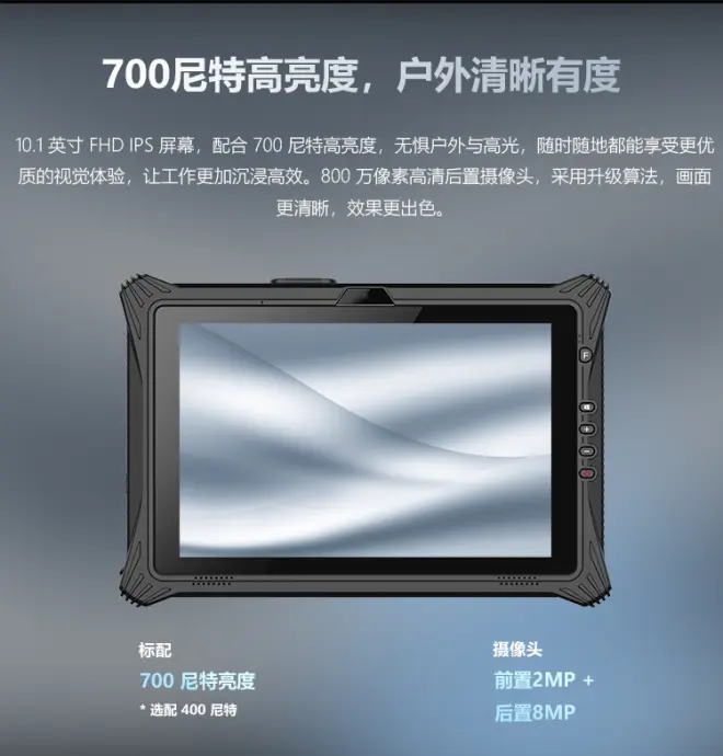 工业三防平板配备了10.1英寸FHD IPS屏幕,具备700尼特高亮度。这意味着平板在户外和高光环境下也能够保持良好的可视性,让用户能够随时随地享受更优质的视觉体验。而且,平板还搭载了800万像素高清后置摄像头,采用了升级算法,使得画面更加清晰,效果更加出色。这对于工业领域的用户来说,能够提升他们的工作效率和准确性。