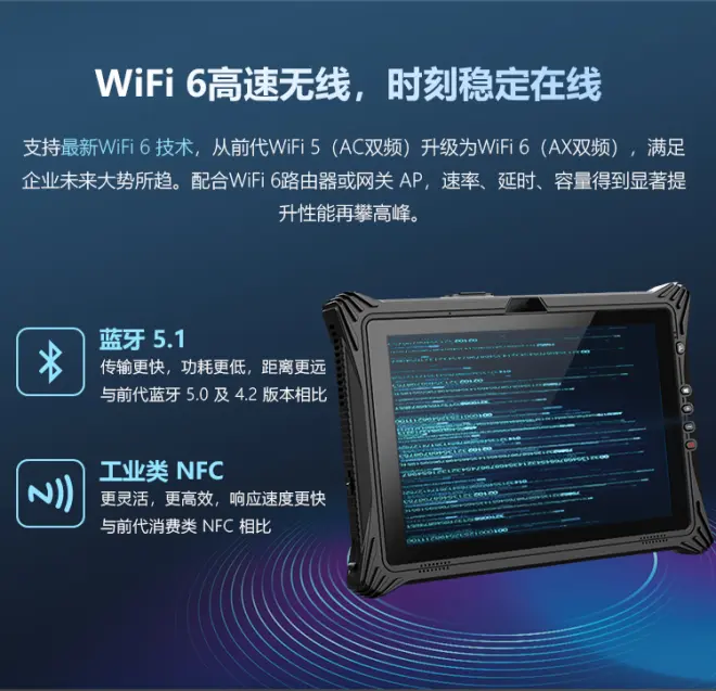 工业三防平板支持最新的WiFi6技术,使其能够满足企业未来的大势所趋。WiFi6与前代WiFi5相比,能够显著提升速率、延时和容量。配合WiFi6路由器或网关AP的使用,该平板的性能将再攀高峰,满足用户对于高效网络体验的需求。