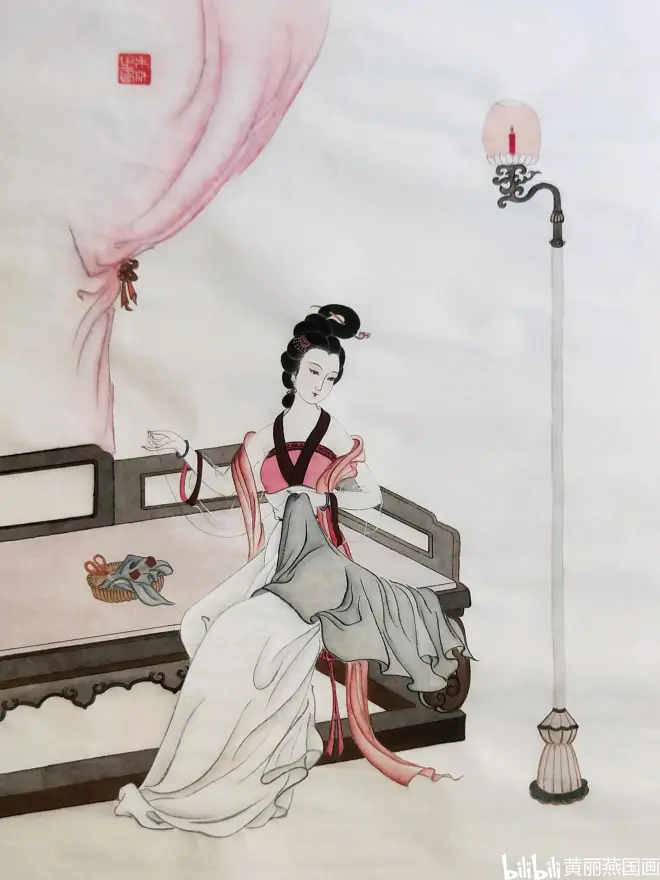 夏夜针黹图(黄丽燕国画古典工笔画传统人物画仕女图)