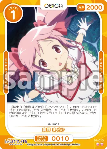 鹿目圆——主打无法阻挡,除了4级SR是直接无法阻挡外,其他的无法阻挡效果都有数值限制,所以还需要减值配合,本家给的两张减值卡都有4000足够使用了。值得特别一提的是,设计师在1级角色上做了些花样,角色[010]可以通过“行动”把自己送墓,是从舞台区离场时则抽2,搭配本家事件[089]使用,瞬间就能过5张牌,爆炸抽牌有点酷炫。而角色[011]则是从舞台区离场时就可以回手,终极炮灰王诞生了!(虽然1000的身板很明显会成为对方的经验包)