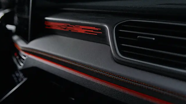 探岳黑火山版别具一格的光遇贯穿式尾灯,也将黑的力量与火山的勇猛无隙相融,更显霸气;而内饰独有的橙色缝线,如同流动的岩浆,所及之处触目亮眼,给人无限遐想的美感;凌厉的黑色一体式贯穿律动腰线,则如火山岩壁迎风耸立,尽显壮观大气。