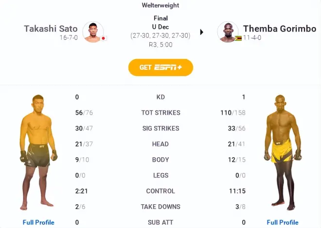 第三回合,准备放手一搏的佐藤天,很快又被摔倒至下位。戈林博在3分57秒的控制时间里,同样无力实现终结。双方战罢全场,戈林博以30比27的大比分,一致判定赢得UFC首胜。